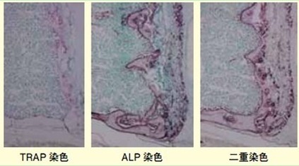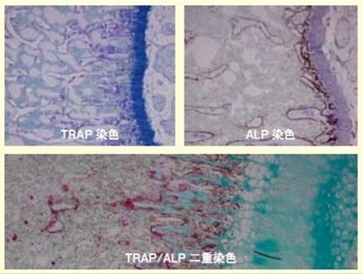了解活體的骨代謝狀態(tài)是研究相關(guān)細(xì)胞生理活性的一個(gè)有效方法。對(duì)骨組織進(jìn)行堿性磷酸酶(ALP)染色后可以了解成骨細(xì)胞的骨形成情況,對(duì)骨組織進(jìn)行抗酒石酸酸性磷酸酶(TRAP)染色可以了解破骨細(xì)胞的骨吸收情況。若在同一切片上進(jìn)行雙重染色就能同時(shí)了解兩者的情況。另外,它有一個(gè)優(yōu)點(diǎn)是在脫鈣標(biāo)本里,只要可以雙重染色,無需專用的設(shè)備,僅用一般的設(shè)備就可以方便地觀察到骨代謝。在此前提下,我們需要研究探討雙重染色的可行性。