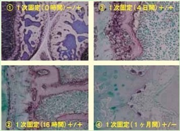 ALP是含有金屬(Zn)的蛋白。脫鈣作用會(huì)使Zn也一并被除去而導(dǎo)致酶失去活性。為了彌補(bǔ)這個(gè)缺點(diǎn),加入硫酸鋅(ZnSO4),使ALP活化。每100ml的脫鈣溶液加入0.4ml 1%的ZnSO4 溶液,以補(bǔ)充Zn。并且,在作為脫鈣溶液檸檬酸鹽酸鹽緩沖液中添加Zn的同時(shí),加入相同量螯合劑EDTA溶液的相關(guān)研究在進(jìn)行中。也有研究在酸性脫鈣溶液(甲酸福爾馬林溶液)中的酶是否能反應(yīng)。結(jié)果顯示脫鈣溶液與檸檬酸一樣,在EDTA溶液中能很好地染色。相反,在甲酸福爾馬林溶液中不能使酶染色(圖4)。此外脫鈣方法是用超聲波脫鈣裝置(Histra-DC,普通光度)在8-16℃的低溫下,連續(xù)操作3-6天,使樣品脫鈣。脫鈣后用甘氨酸與佛羅那 (Veronal)緩沖液(pH7.4)洗凈,用磷酸鈣在組織上吸附,防止沉淀。
