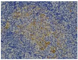 在馬同學(xué)的人淋巴結(jié)石蠟切片上,也觀察到了陽(yáng)性染色。