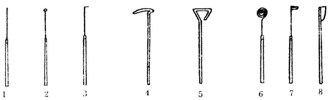 1.接種針 2.接種環(huán) 3.接種鉤 4.5.玻璃涂棒 6.接種圈 7.接種鋤 8.小解剖刀