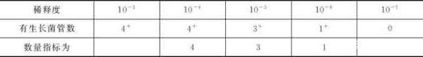 取各重復(fù)管數(shù)都有菌生長的最高稀釋度的生長管數(shù),為數(shù)量指標(biāo)的第一個(gè)數(shù)字,其后兩個(gè)稀釋度的生長管數(shù)作為其他的個(gè)數(shù)。就上例4個(gè)重復(fù)生長的有10-3及10-4兩個(gè)稀釋度,取其中高稀釋度10-4,其中生長管數(shù)“4”作為數(shù)量指標(biāo)的第一位數(shù)字;10-5為3及10-6為1,因此所得數(shù)量指標(biāo)為4、3、1。