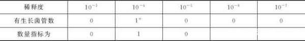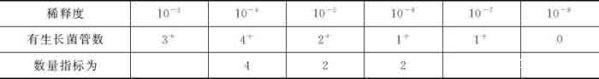 依原則1)數(shù)量指標(biāo)第一數(shù)字應(yīng)取10-4的4,其后兩個(gè)數(shù)字是“2”和“1”,可是更高稀釋度10-7中還有1管生長,因而需將這個(gè)管加在第三個(gè)數(shù)上,所以數(shù)量指標(biāo)數(shù)為4、2、2。