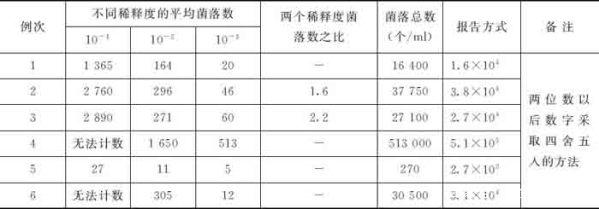 若有兩個(gè)稀釋度,其平均菌落數(shù)均在30~300之間,應(yīng)按兩者菌落總數(shù)之比值來決定。若其比例小于2應(yīng)報(bào)告兩者的平均數(shù),若大于2則報(bào)告其中稀釋度較小的菌落總數(shù)(表10-1中例2、例3)。