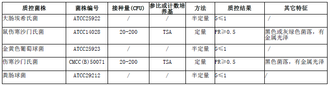 按標(biāo)簽用法制備培養(yǎng)基,接種以下質(zhì)控菌株,放置36±1℃需氧培養(yǎng)40-48小時(shí)。